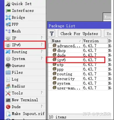 首先需要确认你的 RouterOS 已经安装并启用了 IPv6 功能包,MikroTik 硬件的 RouterOS 都带有 IPv6 功能