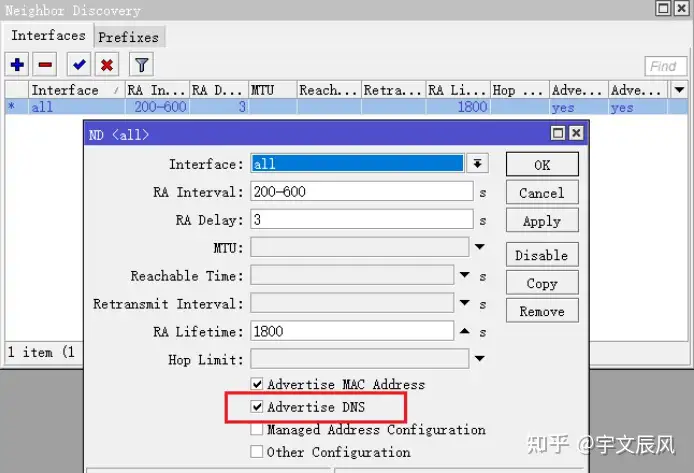 ND 分配方式,确保 IPv6->ND 菜单下的 Advertise DNS 勾选,用于 ND 为主机的 DNS 分配