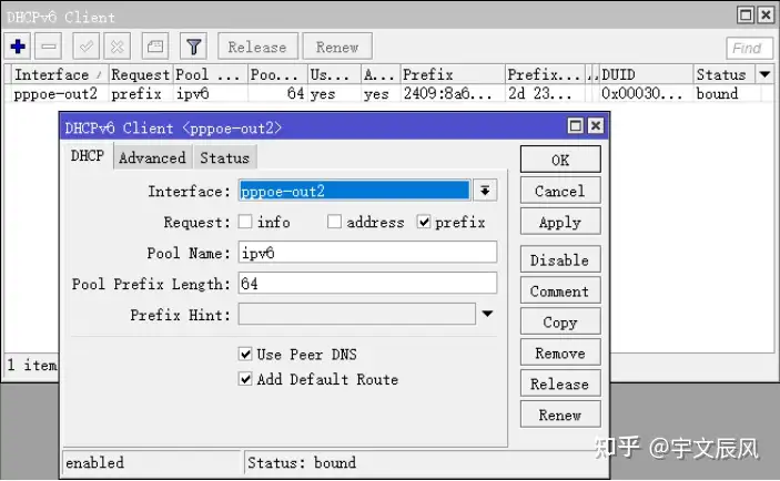 IPv6->DHCPv6-client 菜单,添加 pppoe-out2 的拨号接口,请求方式选择 prefix,将获取的 IPv6 地址,添
