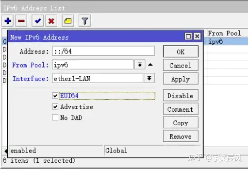 interface=ether1-LAN 内网口,启用 EUI64(IPv6 地址生成通过网卡 MAC 地址),当然也可以不选择 EUI64,